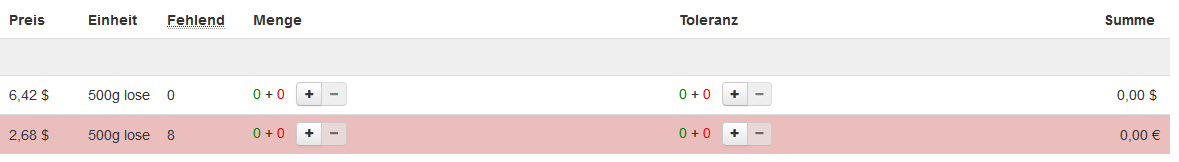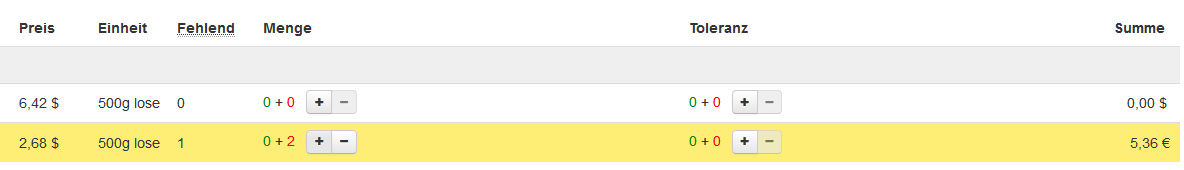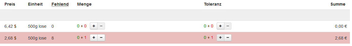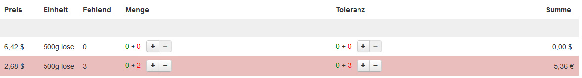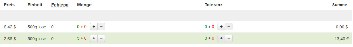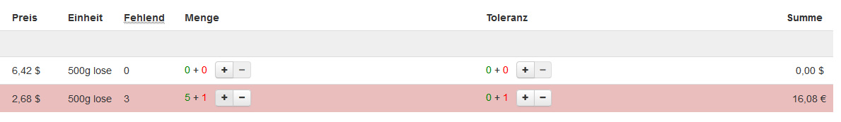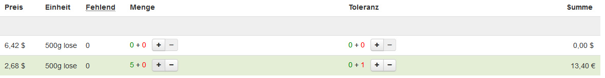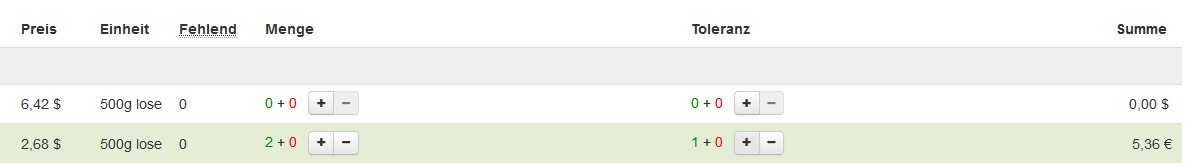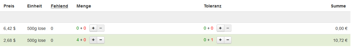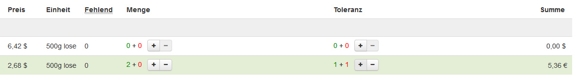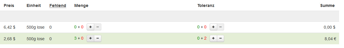 Die dritte Bestellgruppe gibt noch eine Toleranz von 1 an: Damit geht es auf, die Zeile wird grün eingefärbt und die Zahlen springen auf die linke Seite vom + (also Menge "2 + 0" statt vorher "0 + 2"), weil diese Menge nun erhalten werden würde.