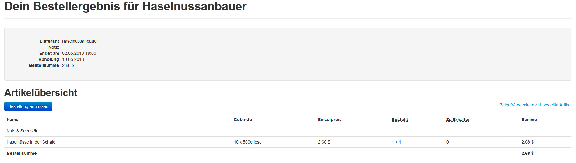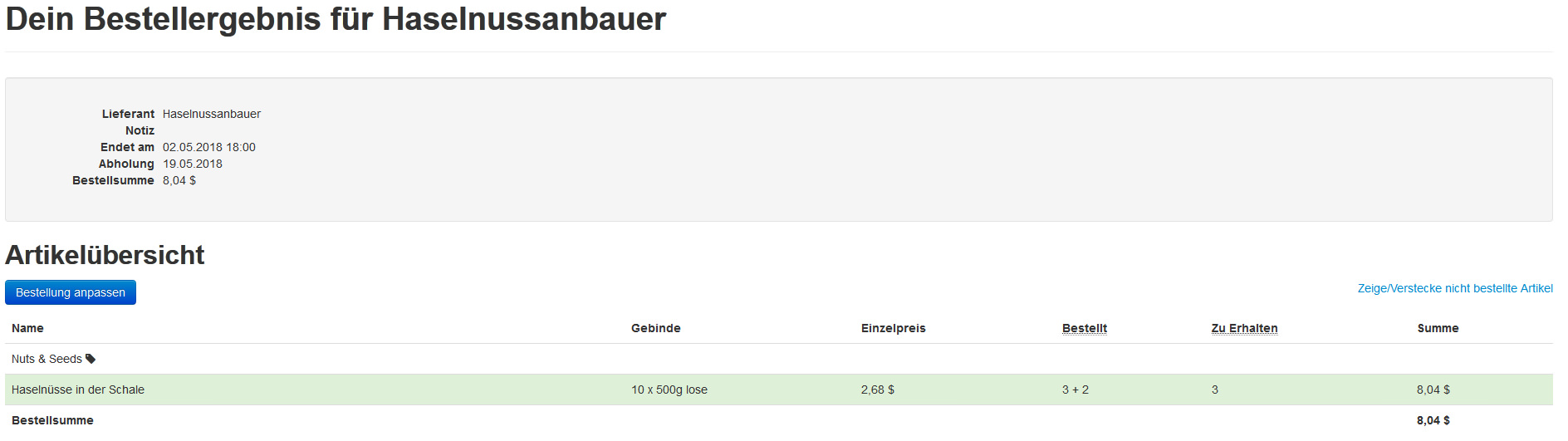 Die Bestellübersicht zeigt bei "Bestellt" nun "Menge + Toleranz" an. Da es nicht für ein Gebinde ausreicht, würde sie nichts erhalten.