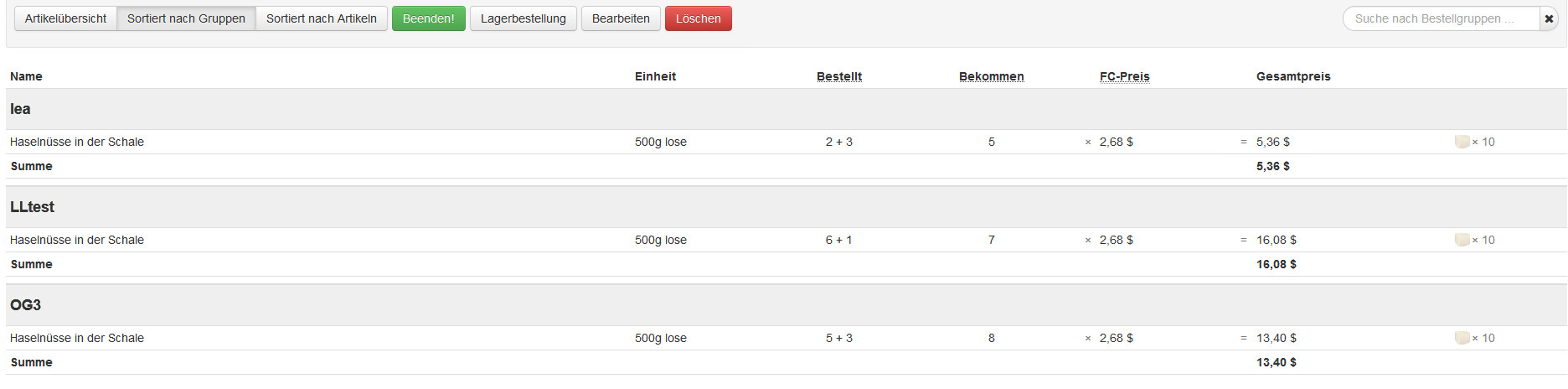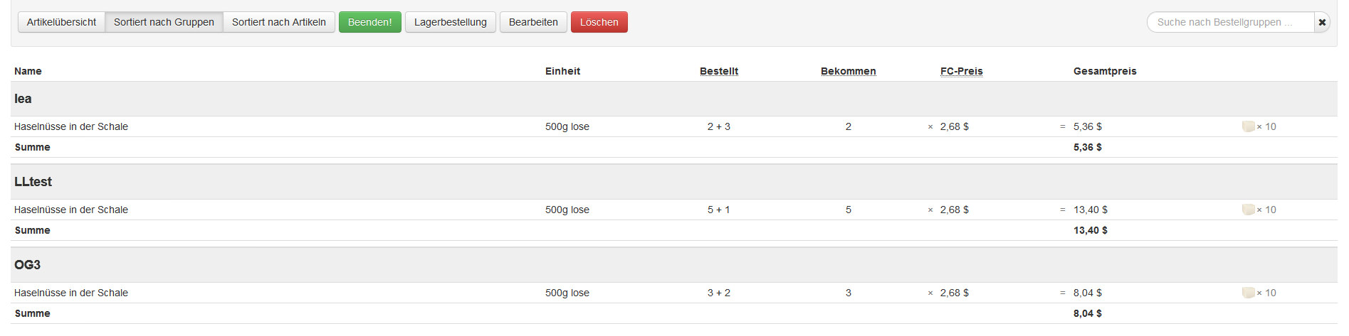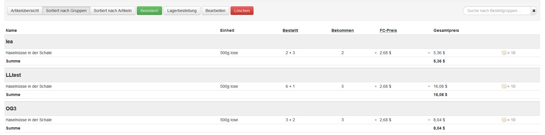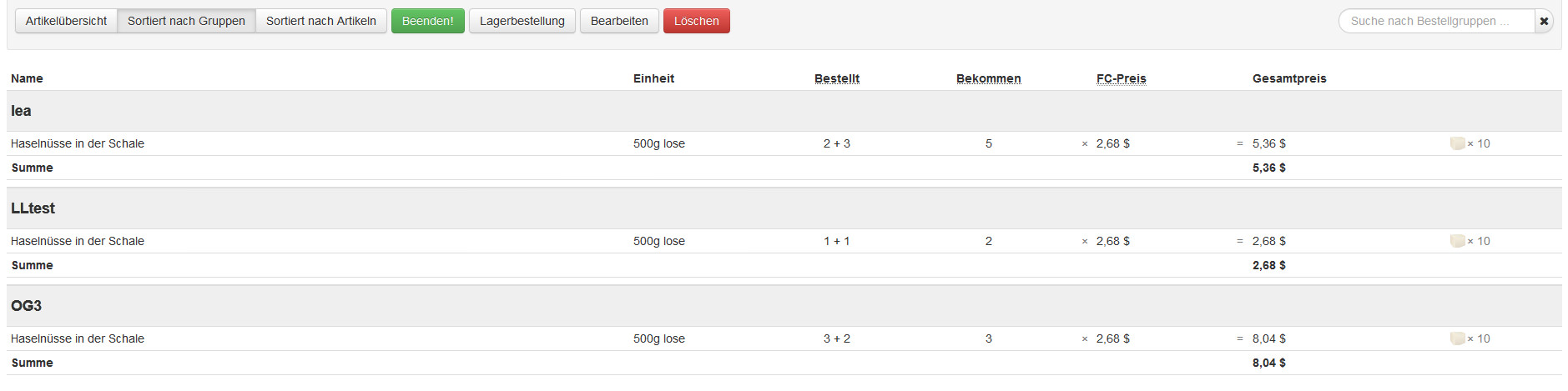 Nun ein Blick in die Bestellübersicht, die nur für Admins einsehbar ist: Die Foodsoft ordnet automatisch zu, wie das Gebinde aufgeht. Da LLTest und lea zuerst bestellt haben, wird deren Toleranz dafür genutzt. Die Toleranz von OG3 (dritte Bestellgruppe) ist dann nicht mehr nötig, daher steht bei "Bekommen" nur die Menge.